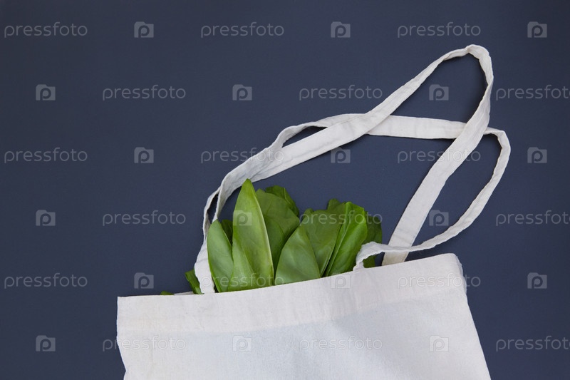 Экологичная сумка для покупок из ткани с зелеными листьями салата на темно-синем фоне