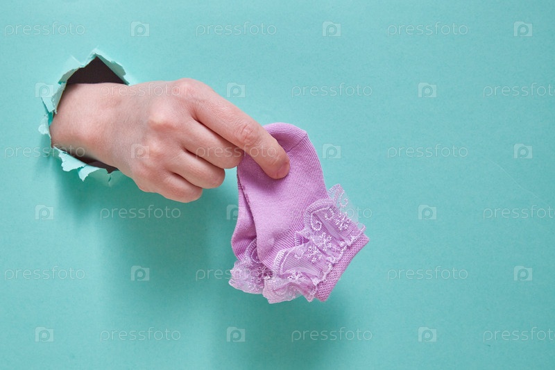 Пригласительный билет на детский душ или объявления о беременности в социальных сетях.Детские носки в женских руках из круглого отверстия в зеленой бумаге