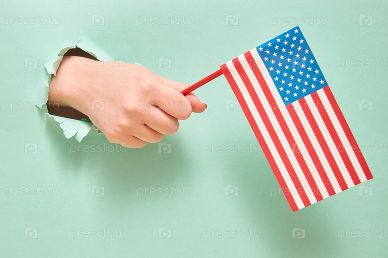 Рука из дыры в зеленой бумаге держит американский флаг с синими звездами. Концепция Дня независимости Америки. Копировать пространство