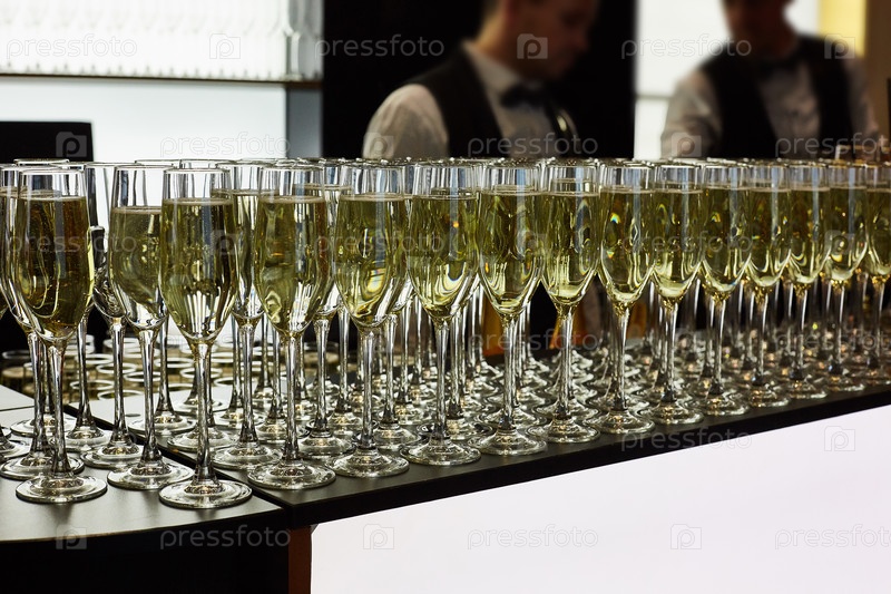 Бокалы с шампанским на столе. На заднем плане два официанта