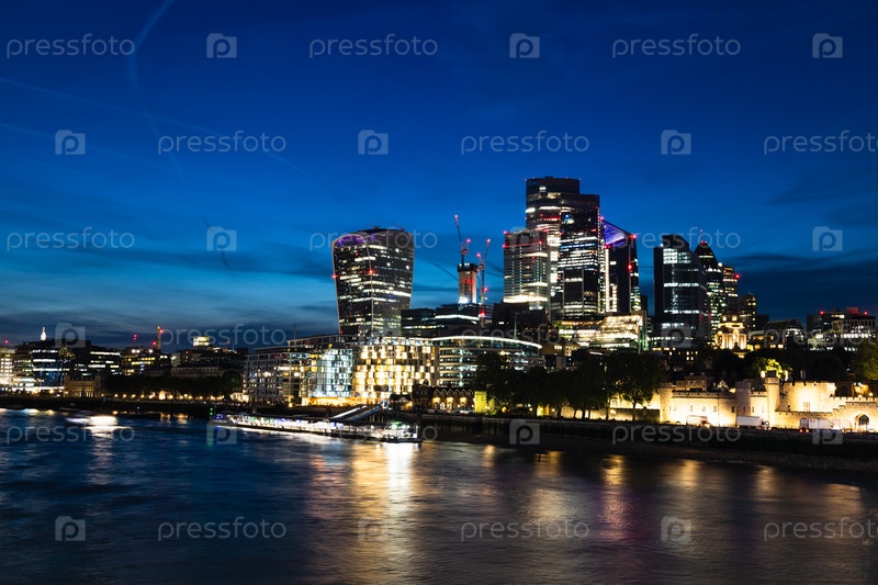 Ночной Лондонский городской пейзаж с подсвеченными небоскребами и отражениями Темзы