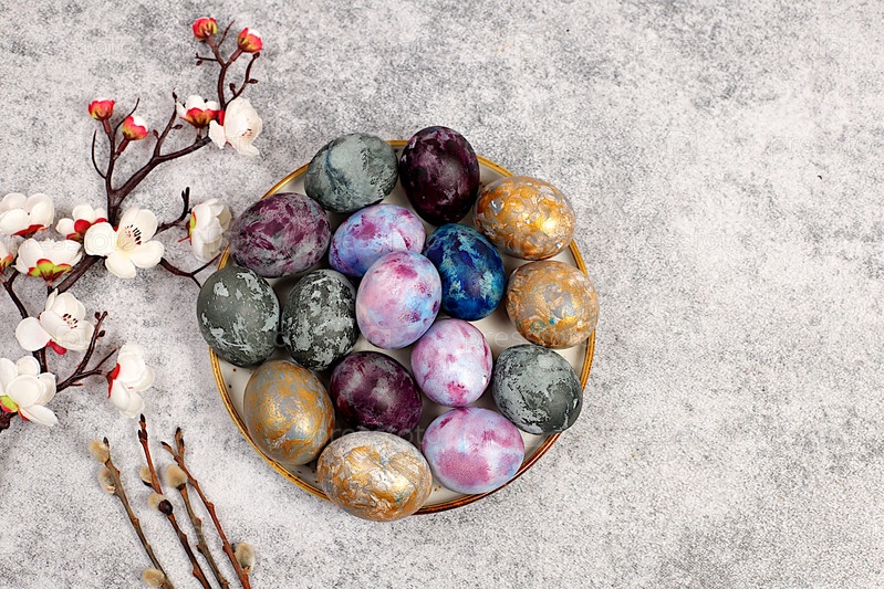 Концепция празднования Пасхи, пасхальные мраморные яйца, окрашенные натуральным чаем из гибискуса, с веткой сакуры на сером фоне бетона. праздничная открытка и идеи для подготовки к великому празднику