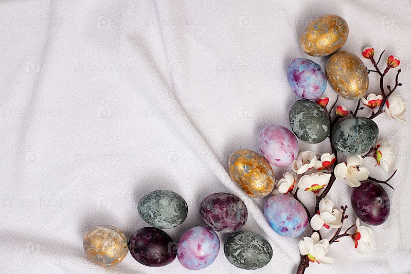 Пасхальные мраморные яйца, окрашенные натуральным чаем из гибискуса, луковой шелухой и куркумином, с веткой сакуры на кухонной скатерти. Концепция празднования Пасхи, праздничная открытка и идеи для подготовки к великому празднику