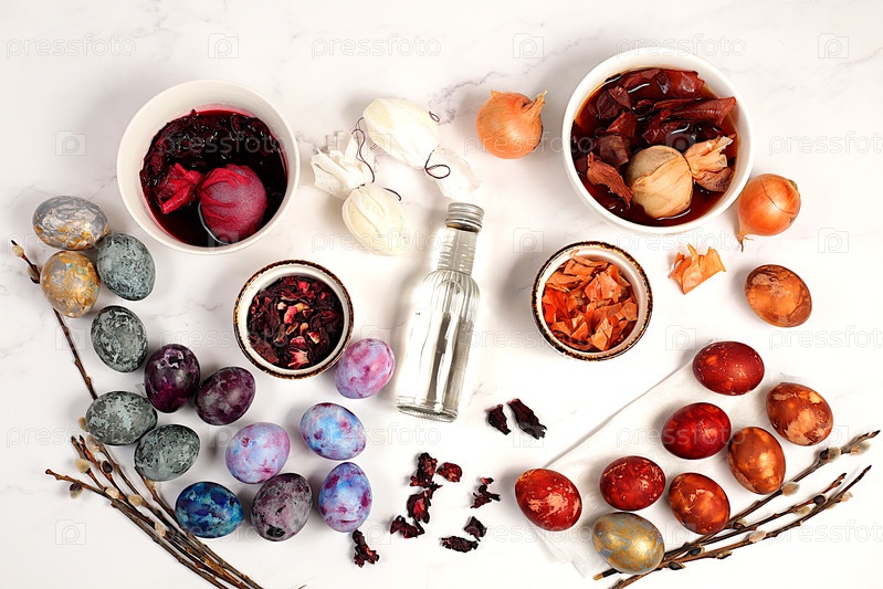 Рецепт окрашивания пасхальных яиц натуральным чаем каркаде, луковой шелухой и куркумином, с веткой ивы на бетонном фоне. Концепция празднования Пасхи, праздничная открытка и идеи для подготовки к великому празднику