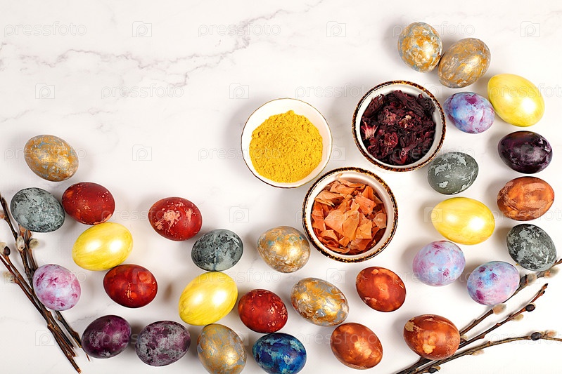 Рецепт окрашивания пасхальных яиц натуральным чаем каркаде, луковой шелухой и куркумином, с веткой ивы на бетонном фоне. Концепция празднования Пасхи, праздничная открытка и идеи для подготовки к великому празднику