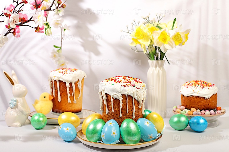 Абстрактная пасхальная композиция с традиционным русским куличом с безе и украшенными яйцами на элегантном кухонном столе с весенними цветами сакуры. Концепция счастливой пасхи
