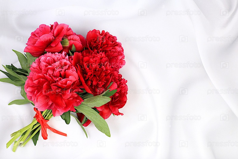 Букет красивых бордовых живых пионов на светлой скатерти, подарок любимому, абстрактная цветочная композиция для праздничной открытки. Шаблон дизайна и фон экрана. Концепция весеннего приветствия
