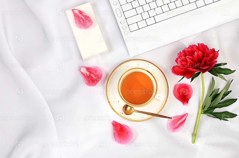 Концепция работы из дома онлайн. Уютный домашний стол с ноутбуком, смартфоном, чаем и букетом нежных пионов и роз. Подарок для близких и поздравления с праздником, солнечное доброе утро