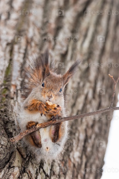 Рыжая белка сидит на ветке дерева в зимнем лесу и грызет семена на фоне заснеженных деревьев