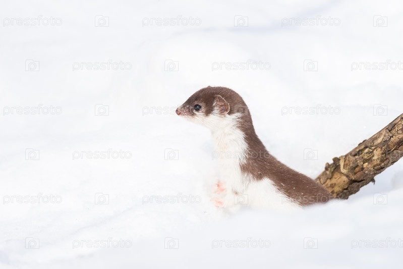 Самая маленькая ласка (Mustela nivalis) в снежном марте