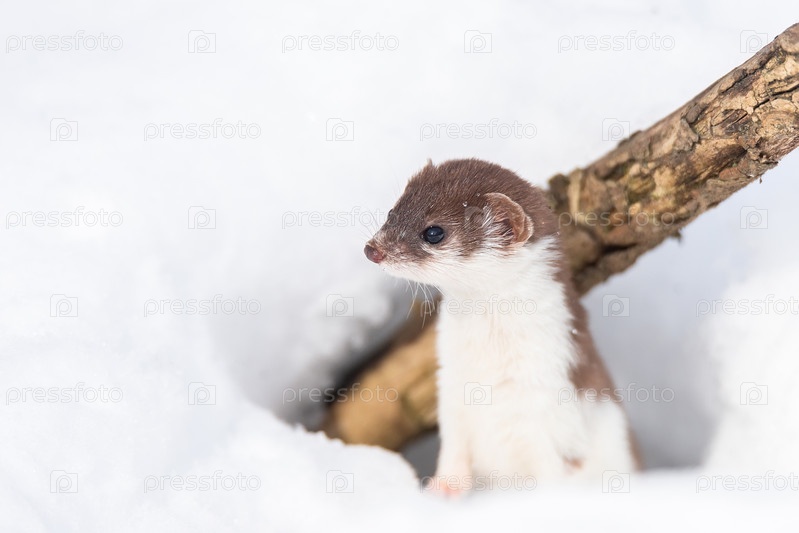 Самая маленькая ласка (Mustela nivalis) в снежном марте
