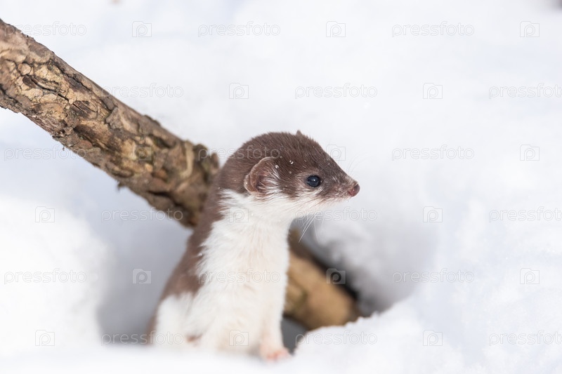 Самая маленькая ласка (Mustela nivalis) в снежном марте