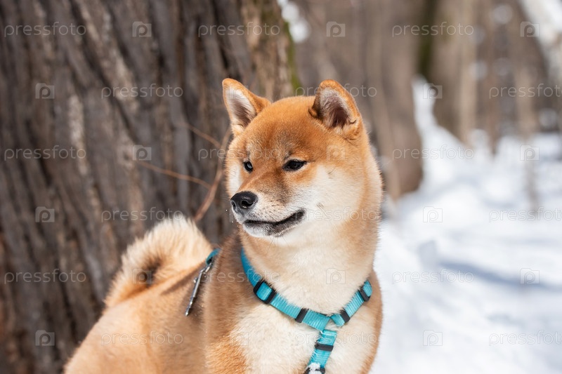 Собака сиба-ину в зимнем снежном сказочном лесу