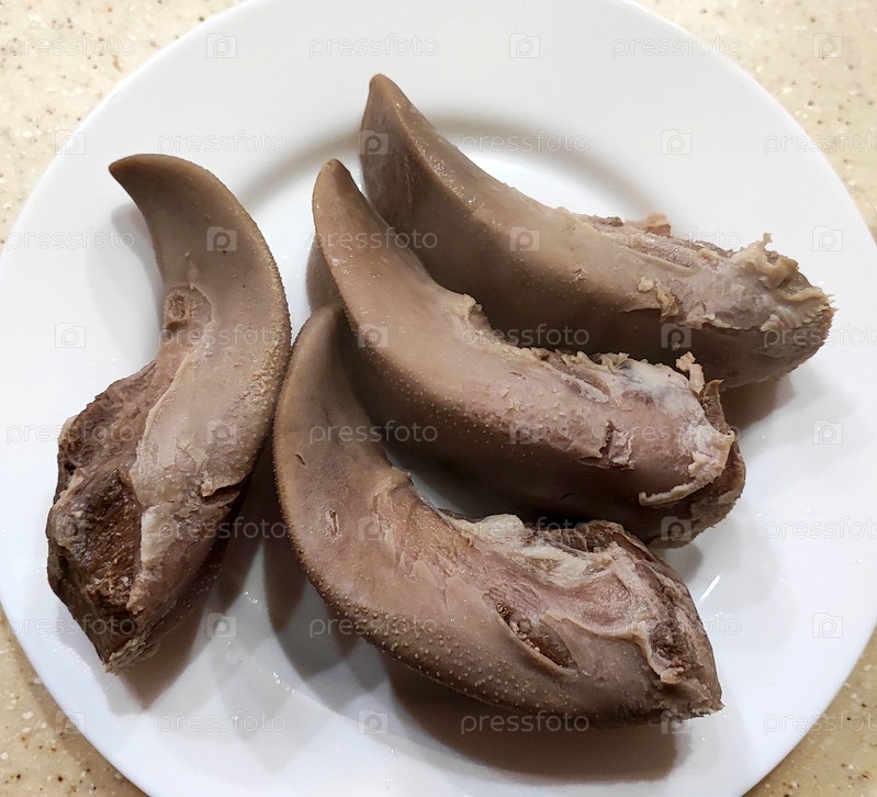 Приготовленный свиной язык на белой тарелке