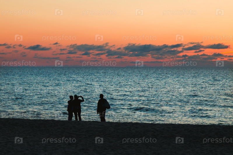 Семья сфотографировалась на берегу моря, красивый закат на заднем плане, силуэты