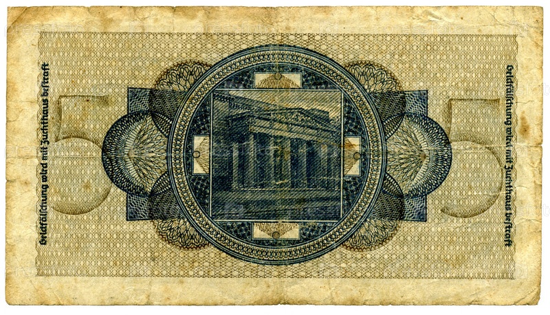 Банкнота достоинством 5 рейхсмарок начала сороковых годов двадцатого века. Германия