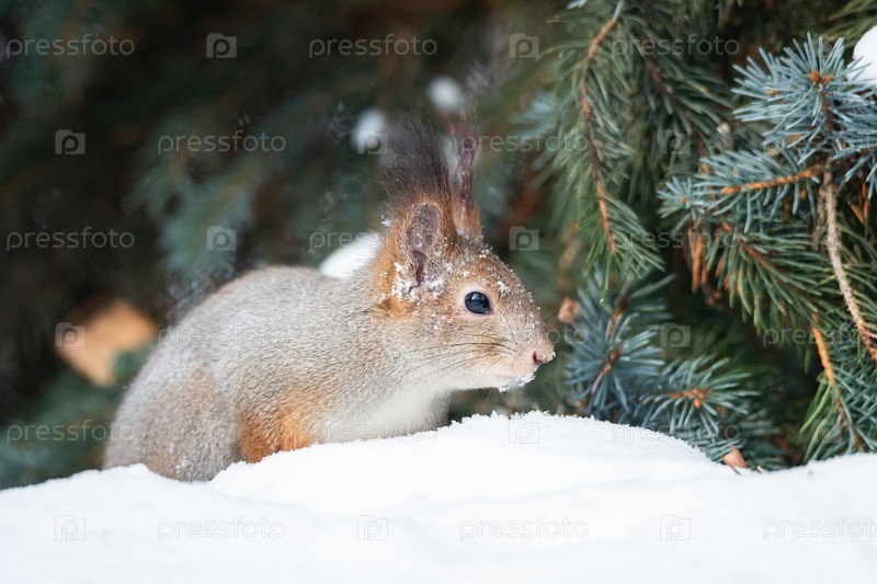 Рыжая белка сидит на ветке дерева в зимнем лесу и грызет семена на фоне заснеженных деревьев