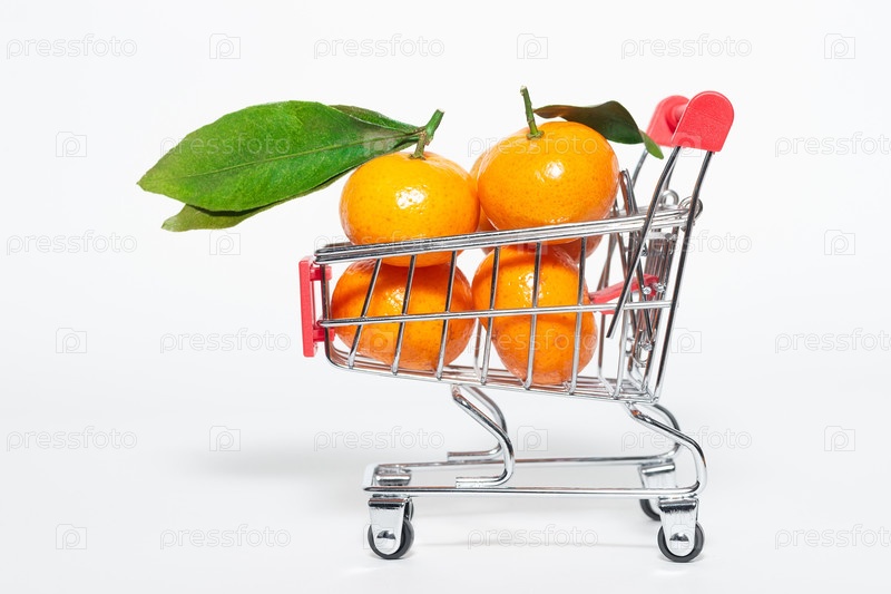 Свежие мандарины и тележка для покупок на белом фоне