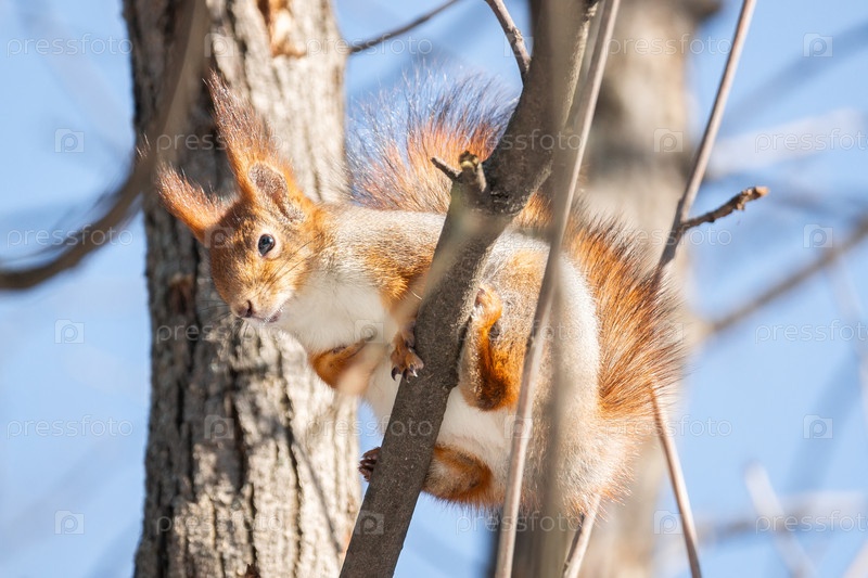 Белка зимой сидит на дереве