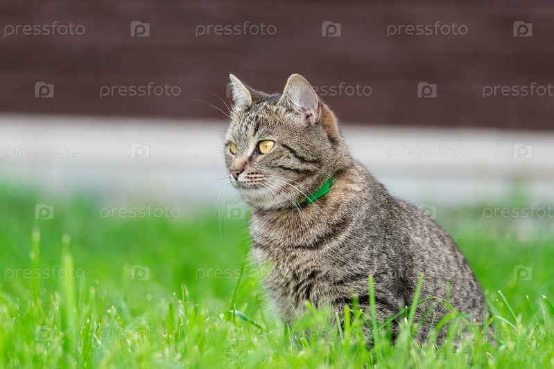 Серый кот на траве