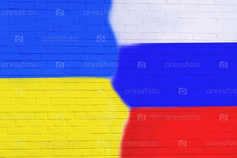 Треснувшая кирпичная стена с нарисованными флагами России и Украины