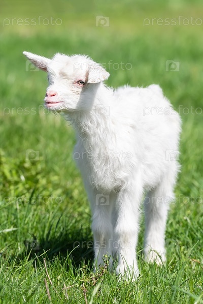 Белый козленок на зеленой траве в солнечный день