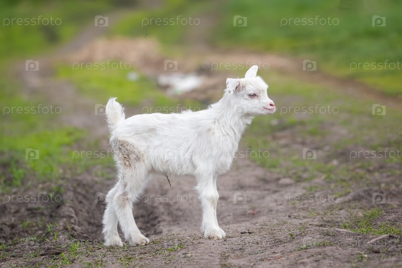 Белый козленок на зеленой траве в солнечный день