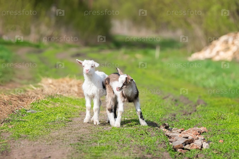 Белый козленок на зеленой траве в солнечный день