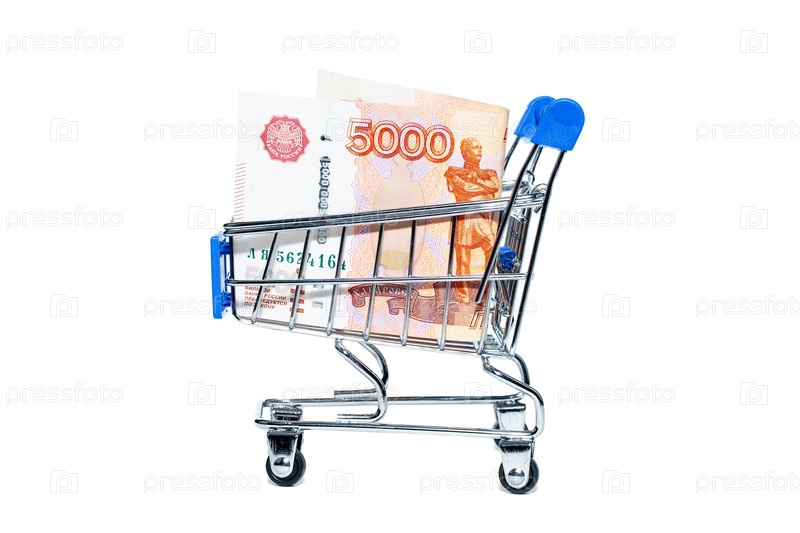 Корзина с российскими рублями внутри