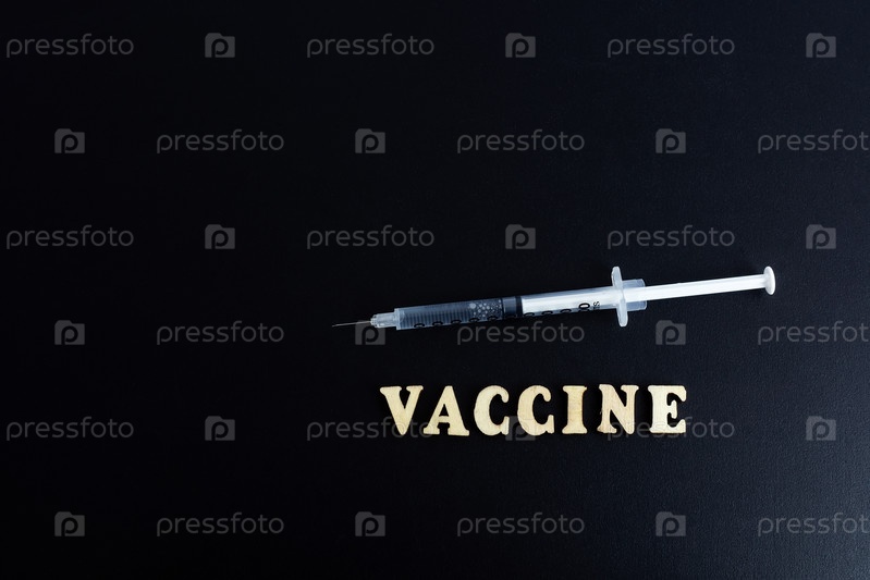 Один шприц с дозой лекарства или вакцины на черном фоне с местом для текста: прививки от гриппа коронавируса