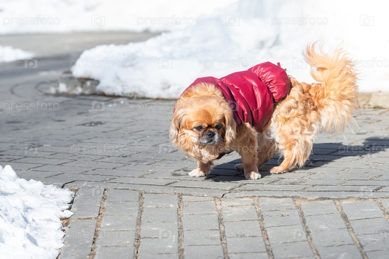 Маленькая собака породы пекинес зимой