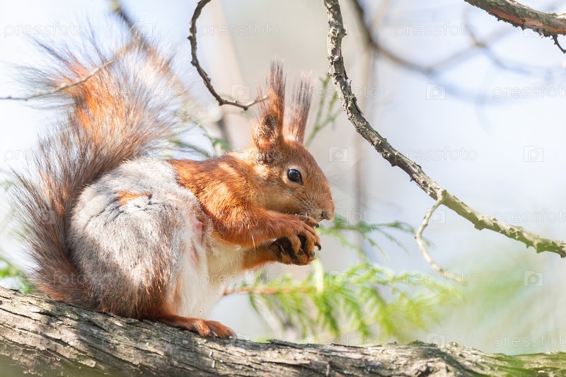 Орехообразная белка сидит на ветке весной или летом.Портрет белки в крупном плане.Евразийская красная белка, Sciurus vulgaris