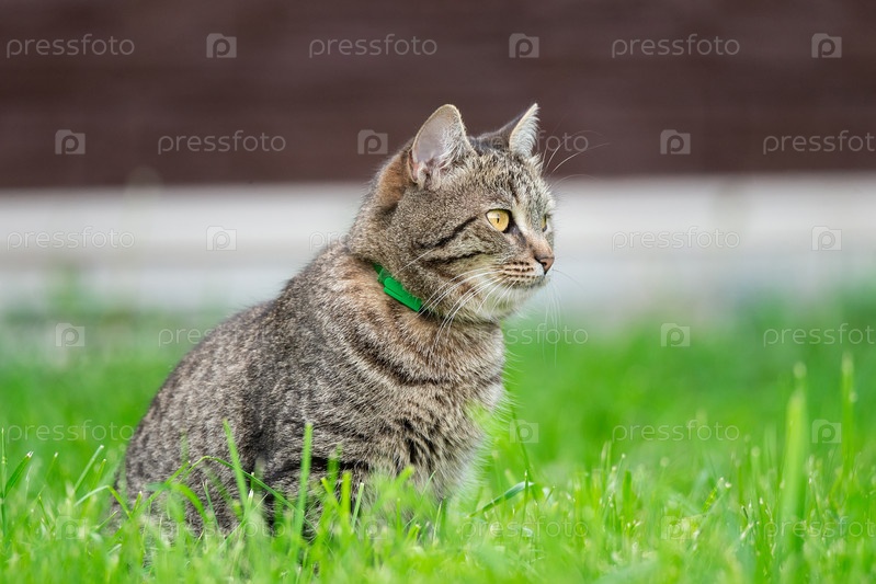 Серый кот на траве