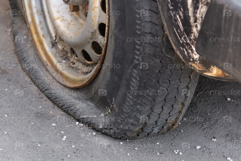 Крупный план спущенной шины автомобиля на дороге