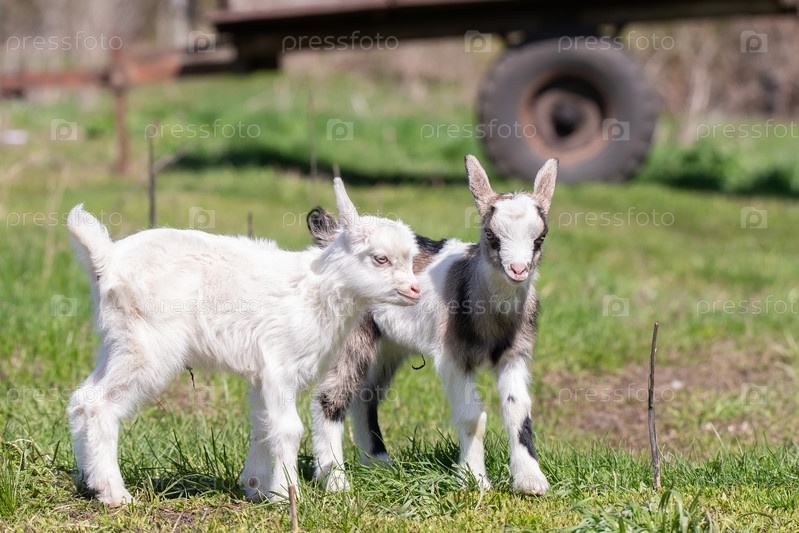 Белый козленок на зеленой траве в солнечный день