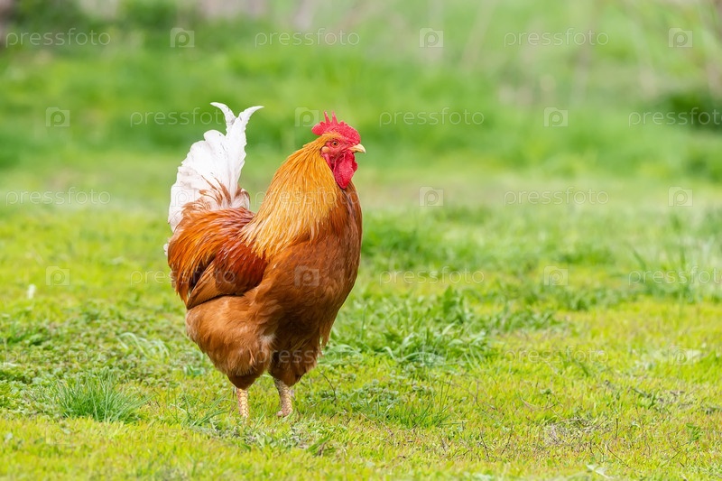 Красивый петух стоит на траве на размытом зеленом фоне природы. Петух собирается кукарекать