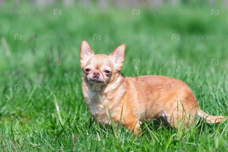 Красный чихуахуа сидит на зеленой траве. Избирательный фокус
