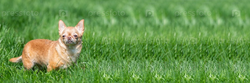 Красный чихуахуа сидит на зеленой траве. Избирательный фокус