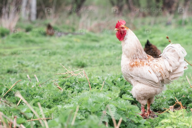 Петух и курица свободного выгула на траве в сельской местности