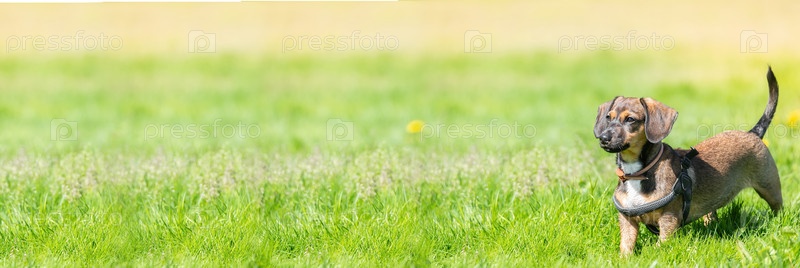 Миниатюрная такса стоит в высокой траве