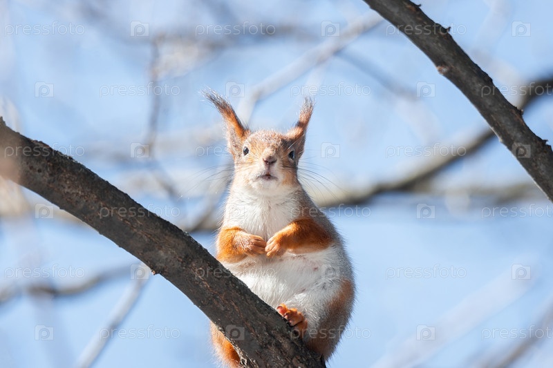 Белка зимой сидит на дереве