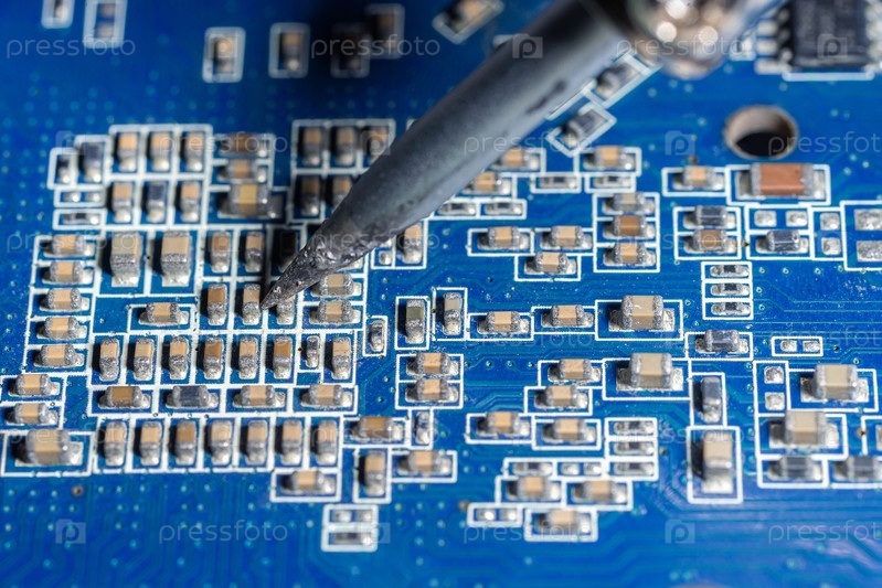 Ремонтник паяет материнскую плату электронного устройства
