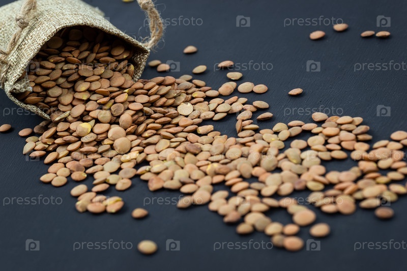 Коричневая сушеная чечевица в мешочке из мешковины на черном фоне