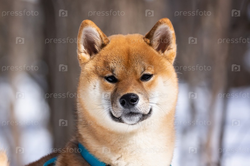 Собака сиба-ину в зимнем снежном сказочном лесу