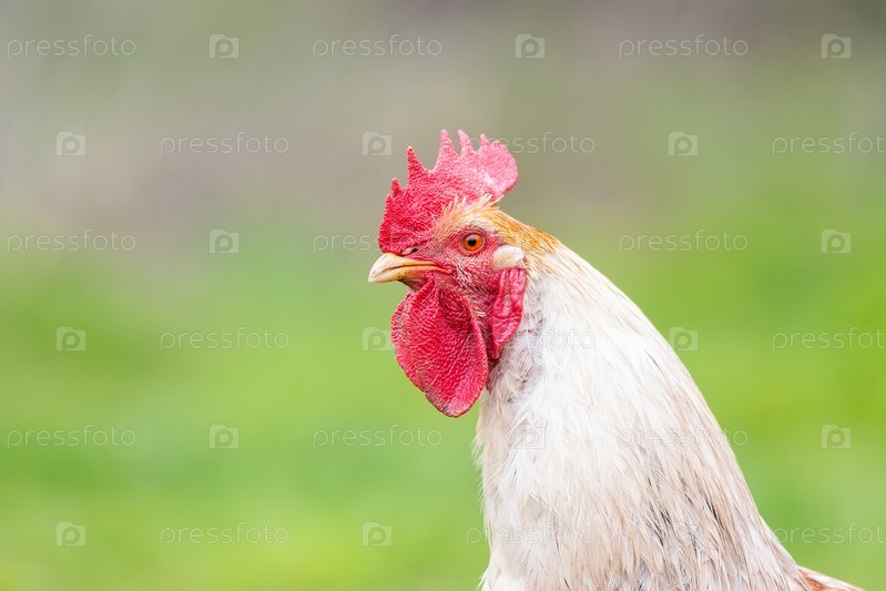 Красивый петух стоит на траве на размытом зеленом фоне природы. Петух собирается кукарекать