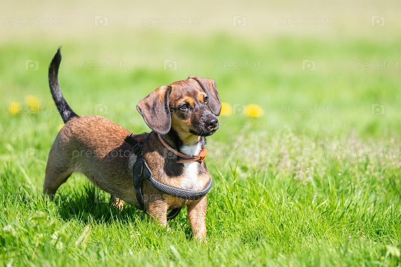 Миниатюрная такса стоит в невысокой траве