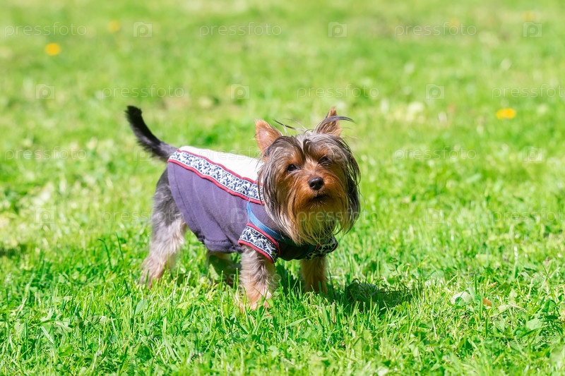 Маленький йоркширский терьер позирует на траве. Собака породы йоркширский терьер
