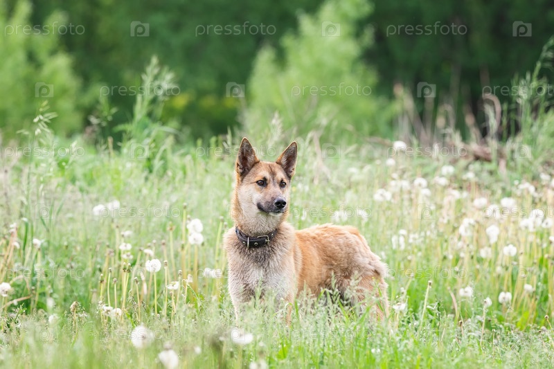 Дворняга рыжего окраса на траве. Лето