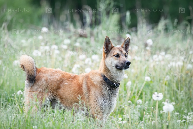 Дворняга рыжего окраса на траве. Лето