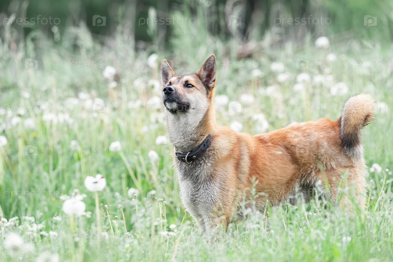 Дворняга рыжего окраса на траве. Лето